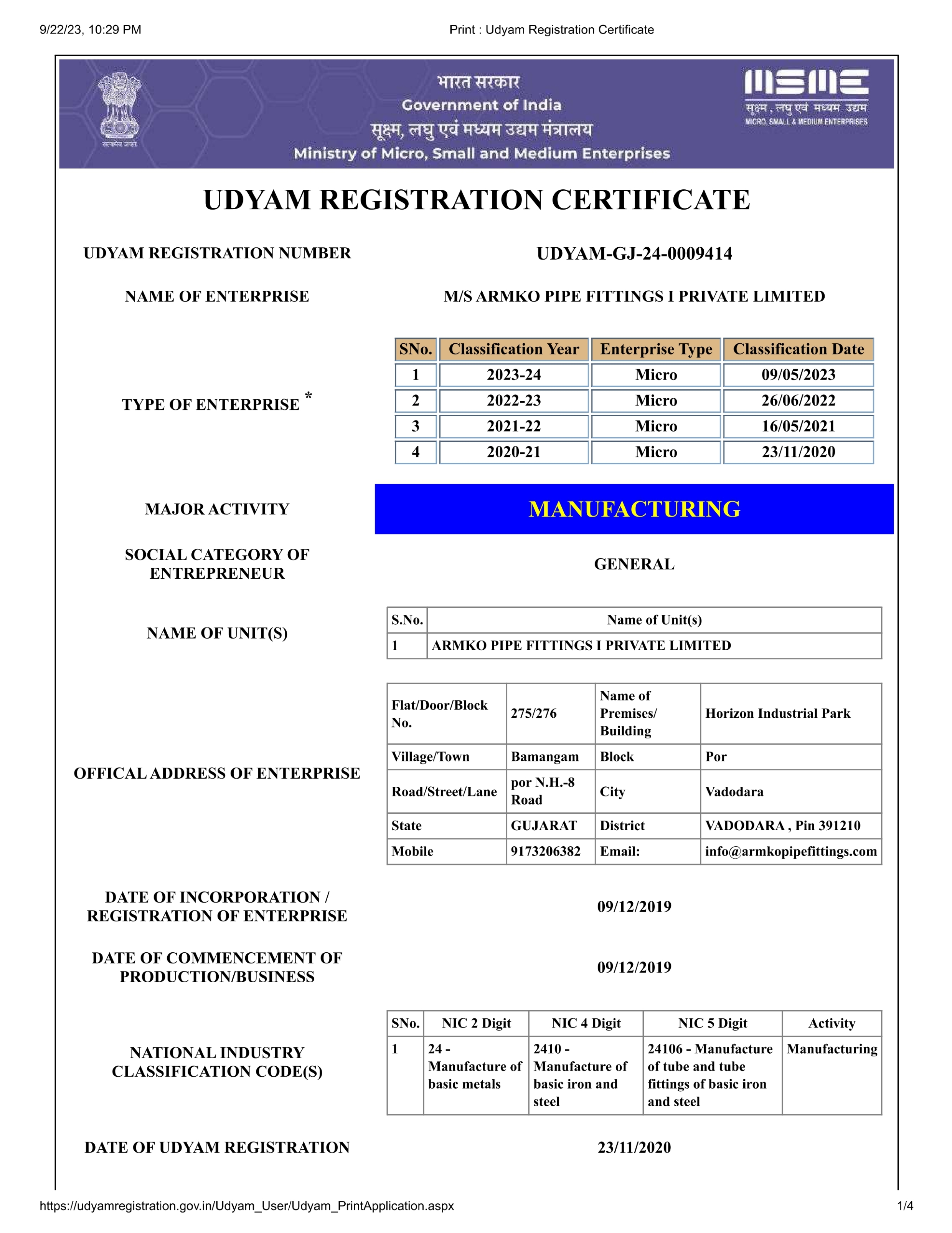 MSME Registration Certificate